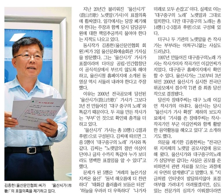 | 울산시가의 표절논란을 접하며… 며칠 전 20년간 불러온 울산시가가 대구 중구 구가를 표절한 것이라는 보도가 있었다. 더구나 두 작사가가 부부 사이인 것으로 알려져 충격이 더해졌다. 이 사실은 전국 일간지에도 게재되면서 논란을 불러일으키고 있다. 지적재산권 침해요건은 1.유효한 저작권이 존재할 것 2.실질적 유사성이 있을 것, 3.의거할 것 등인데 본 사안은 거의 침해가 인정될 것으로 보인다. 공모전의 경우는 대개 저작물과 관련된 일체의 권리는 공모주체가 갖는다고 명시하므로 아마도 대구 중구청과 울산시청이 저작재산권자로서 침해문제의 당사자들이 될 것이다. 한편 울산 시가 응모자, 당시 시청 담당공무원 등에 대한 책임 문제 등도 언급되고 있다. |