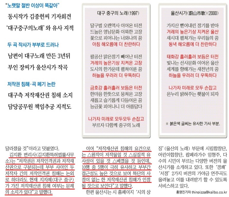 | 김지환 변리사(김지환 특허법률사무소)는 "저작권은 저작인격권과 저작재산권으로 구분되는데 부부 사이인 두 저작자 간의 저작인격권 침해는 논외로 하더라도 현재 지자체(대구 중구) 가 가진 저작재산권 침해 여부는 문제의 소지가 있다"고 말했다. 이어 "저작재산권 침해의 요건으로는 원작이 저작물일 것, 실질적 유사성이 있을 것, 베꼈을 것 등인데, 10행 중 5행이 극히 유사하고 부부간접근성도 높은 것으로 보여 특단의 사정이 없는 한 저작재산권 침해가 인정될 것으로 보인다"고 말했다. (경상일보 기사 중에서 발췌 |
