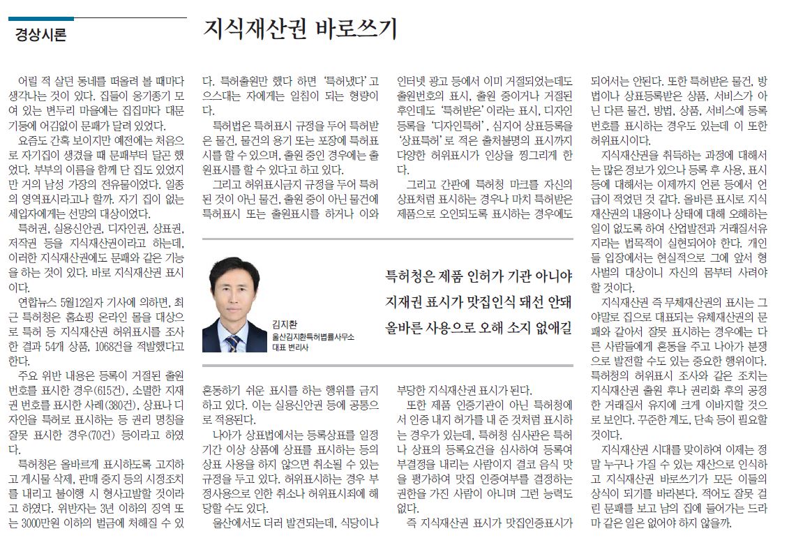 지식재산권 시대를 맞이하여 정말 누구나 가질 수 있는 재산으로 인식하고 지식재산권 바로쓰기가 모든 이들의 상식이 되기를 바라본다. 적어도 잘못 걸린 문패를 보고 남의 집에 들어가는 드라마 같은 일은 없어야 하지 않을까.