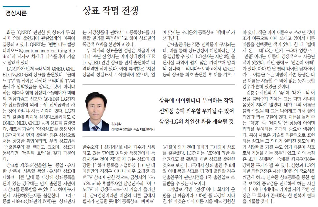 삼성과 LG의 이번 작명전쟁은 새삼 네이밍의 중요성을 깨닫게 하고, 신속한 상표등록을 통한 법적 보호의 중요성을 인식하게 하는 사건이다. 아마 미래에도 라이벌 사의 작명 전쟁은 두 회사가 존재하는 한 반복에 반복을 거듭할 것이다.