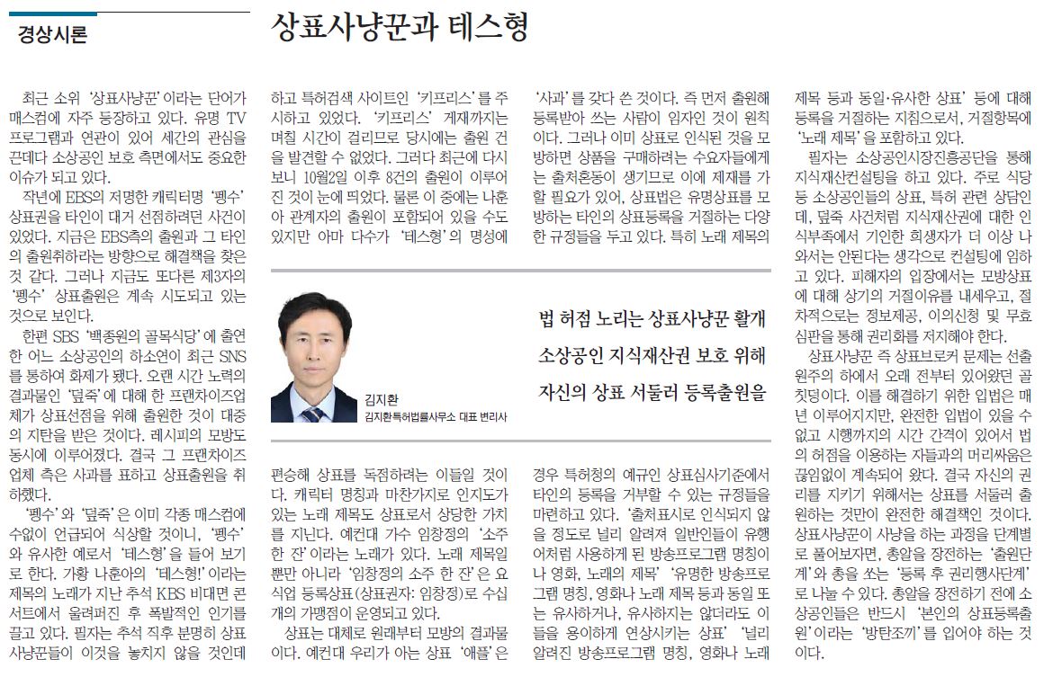 최근 소위 '상표사냥꾼'이라는 단어가 매스컴에 자주 등장하고 있다. 유명 TV프로그램과 연관이 있어 세간의 관심을 끈데다 소상공인 보호 측면에서도 중요한 이슈가 되고 있다.