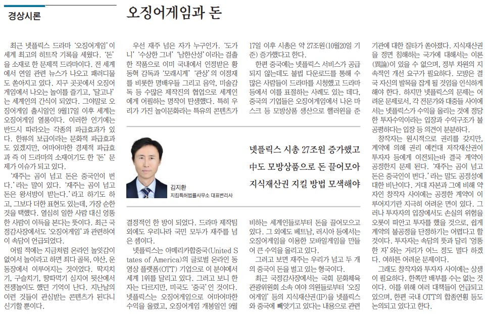최근 넷플릭스 드라마 ‘오징어게임’이 세계 최고의 히트작 기록을 세웠다. ‘돈’을 소재로 한 문제적 드라마이다. 전 세계에서 연일 관련 뉴스가 나오고 패러디물도 쏟아지고 있다. 지구 곳곳에서 오징어게임에서 나오는 놀이를 즐기고, ‘달고나’는 세계인의 간식이 되었다. 그야말로 오징어게임 출시일인 9월17일 이후 세계는 오징어게임 열풍이다. 이러한 인기에는 반드시 따라오는 각종의 파급효과가 있다. 한류의 보급이라는 문화적 파급효과도 있겠지만, 어마어마한 경제적 파급효과 즉 이 드라마의 소재이기도 한 ‘돈’ 문제가 이슈가 되고 있다.