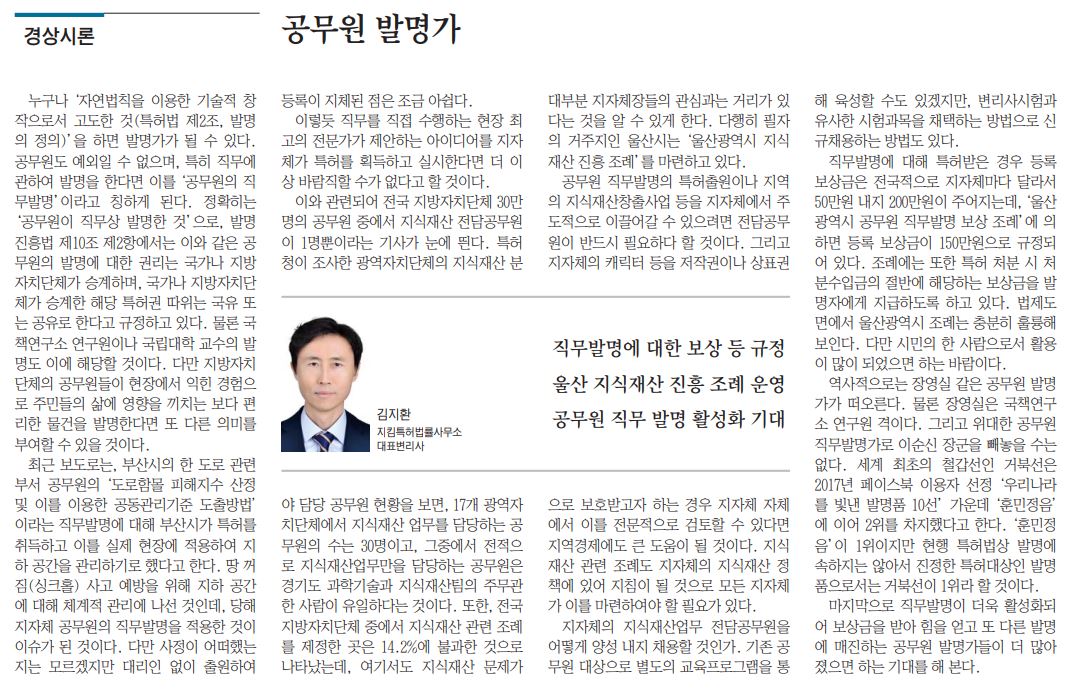 마지막으로 직무발명이 더욱 활성화되어 보상금을 받아 힘을 얻고 또 다른 발명에 매진하는 공무원 발명가들이 더 많아졌으면 하는 기대를 해 본다.