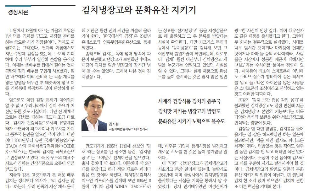 김치냉장고의 발명도 일종의 문화유산 지키기의 일환이 아닐까. 흰 쌀밥에 김치 한 조각 얹어 먹으면서 김치에 관한 또 다른 혁신을 기대해 본다.