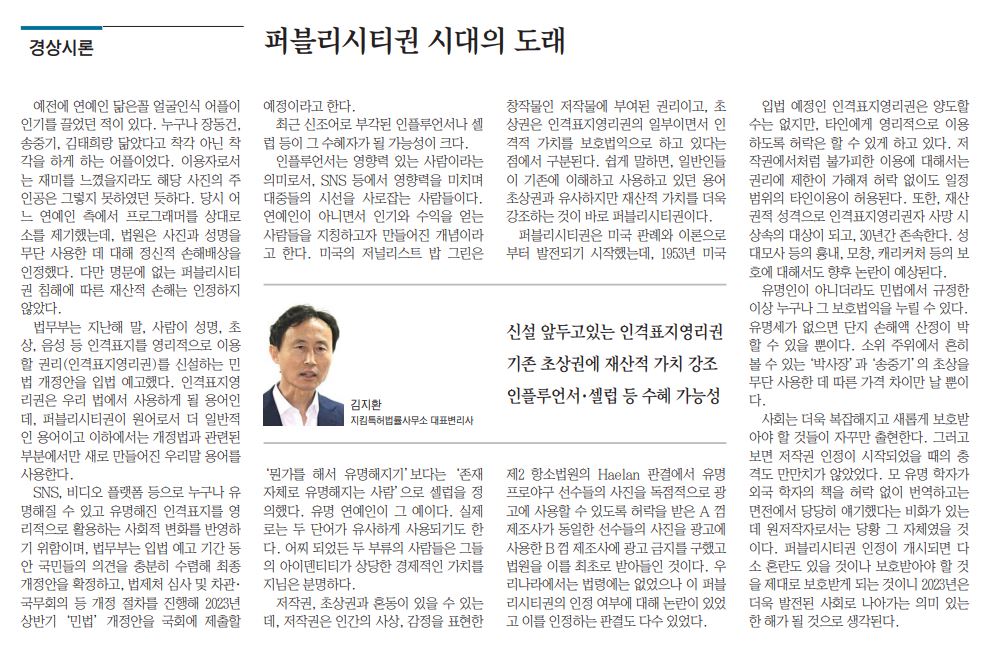 사회는 더욱 복잡해지고 새롭게 보호받아야 할 것들이 자꾸만 출현한다. 그러고 보면 저작권 인정이 시작되었을 때의 충격도 만만치가 않았었다. 모 유명 학자가 외국 학자의 책을 허락 없이 번역하고는 면전에서 당당히 얘기했다는 비화가 있는데 원저작자로서는 당황 그 자체였을 것이다. 퍼블리시티권 인정이 개시되면 다소 혼란도 있을 것이나 보호받아야 할 것을 제대로 보호받게 되는 것이니 2023년은 더욱 발전된 사회로 나아가는 의미 있는 한 해가 될 것으로 생각된다.